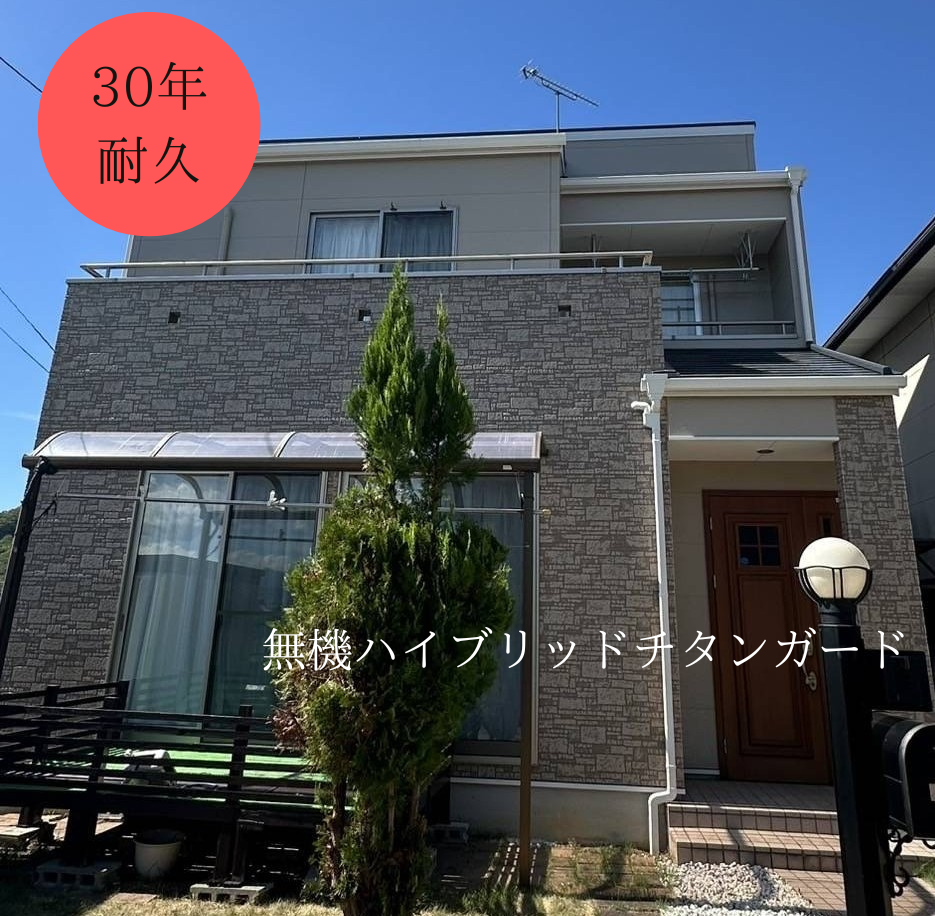 無機ハイブリッドチタンガードとは、最大30年の耐用年数を持つとされる、超耐久性の無機塗料です。オルガノポリシロキサンなどの無機成分と特殊チタンを組み合わせ、紫外線の影響を抑える技術(ラジカル制御)によって、汚れにくさやひび割れしにくさ、高い耐候性を実現しています。外壁だけでなく、屋根や鉄部にも施工可能です。主な特徴
