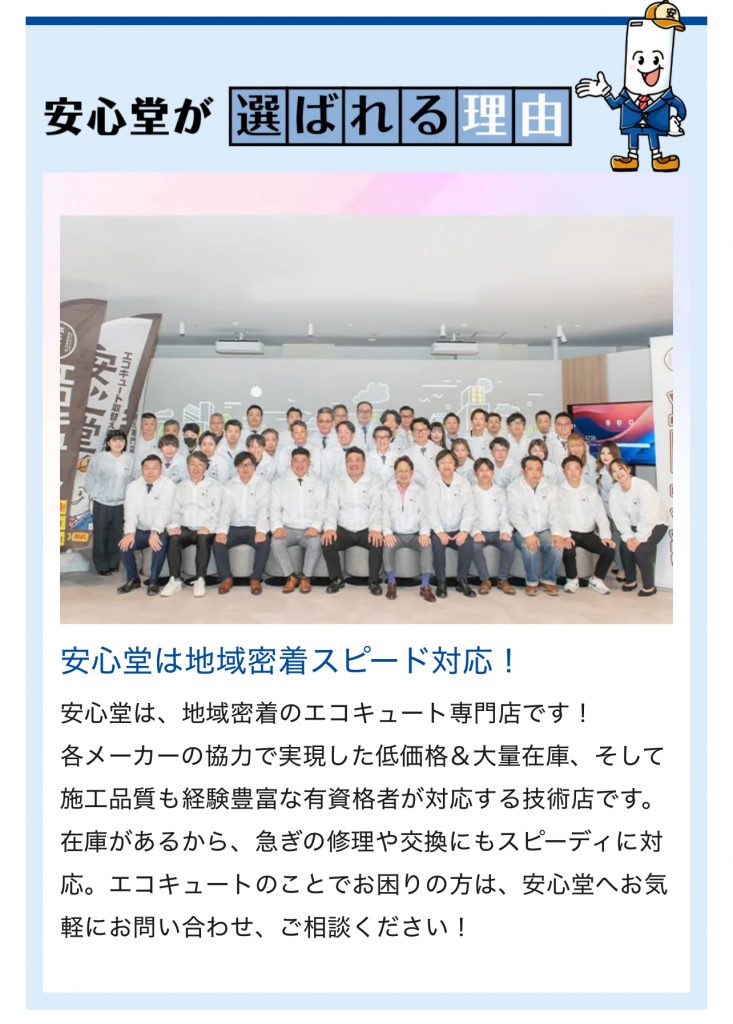 エコキュート専門店「安心堂」が選ばれる主な理由は、「価格」「対応力」「保証」のバランスの良さにあります。特に、以下の6つの点が強みとして挙げられます。