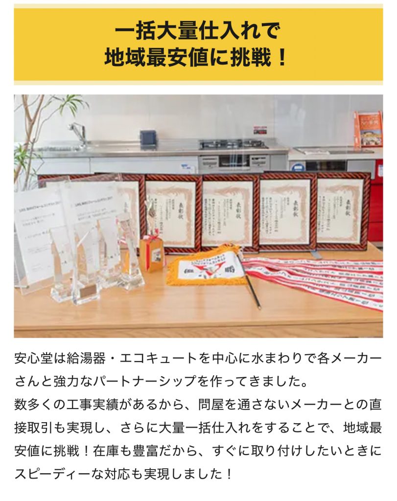 - 一括大量仕入れによる地域最安値:メーカー製品を一括で大量に仕入れることでコストを削減し、地域最安値での提供を実現しています。
